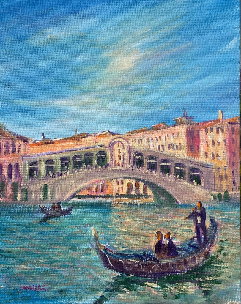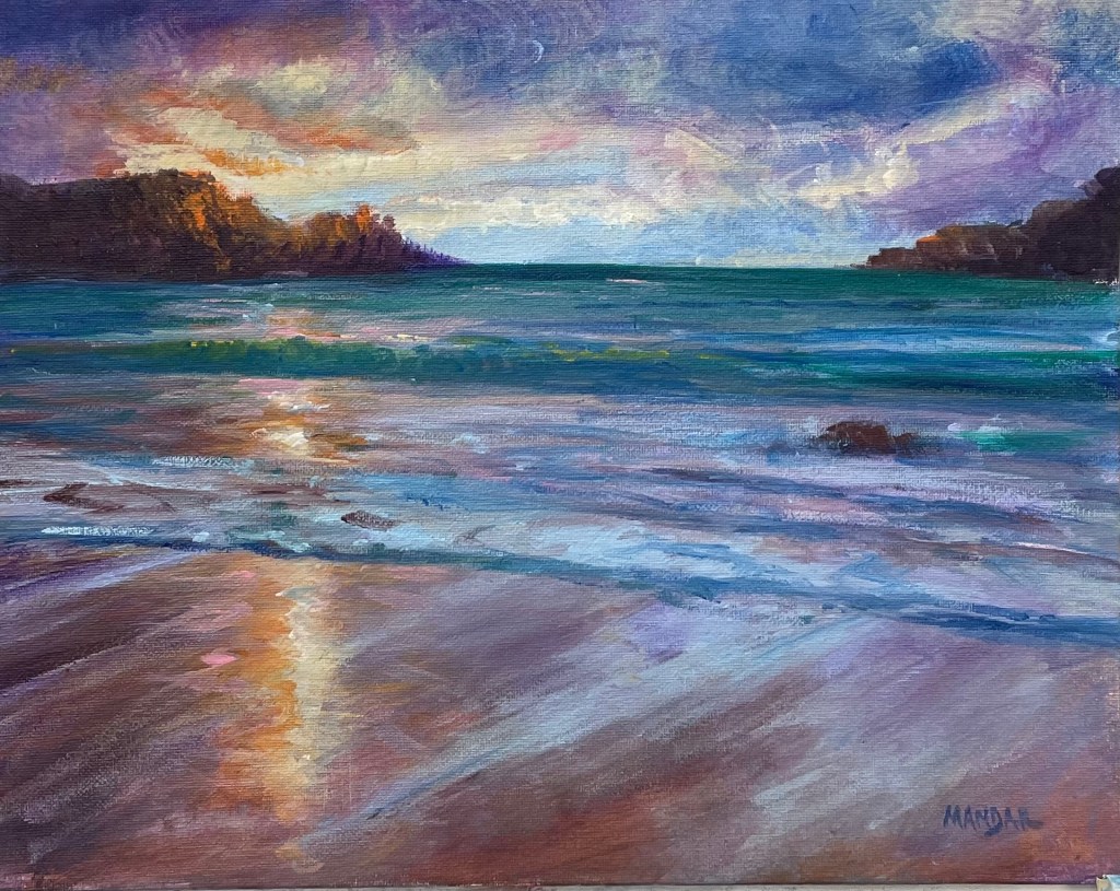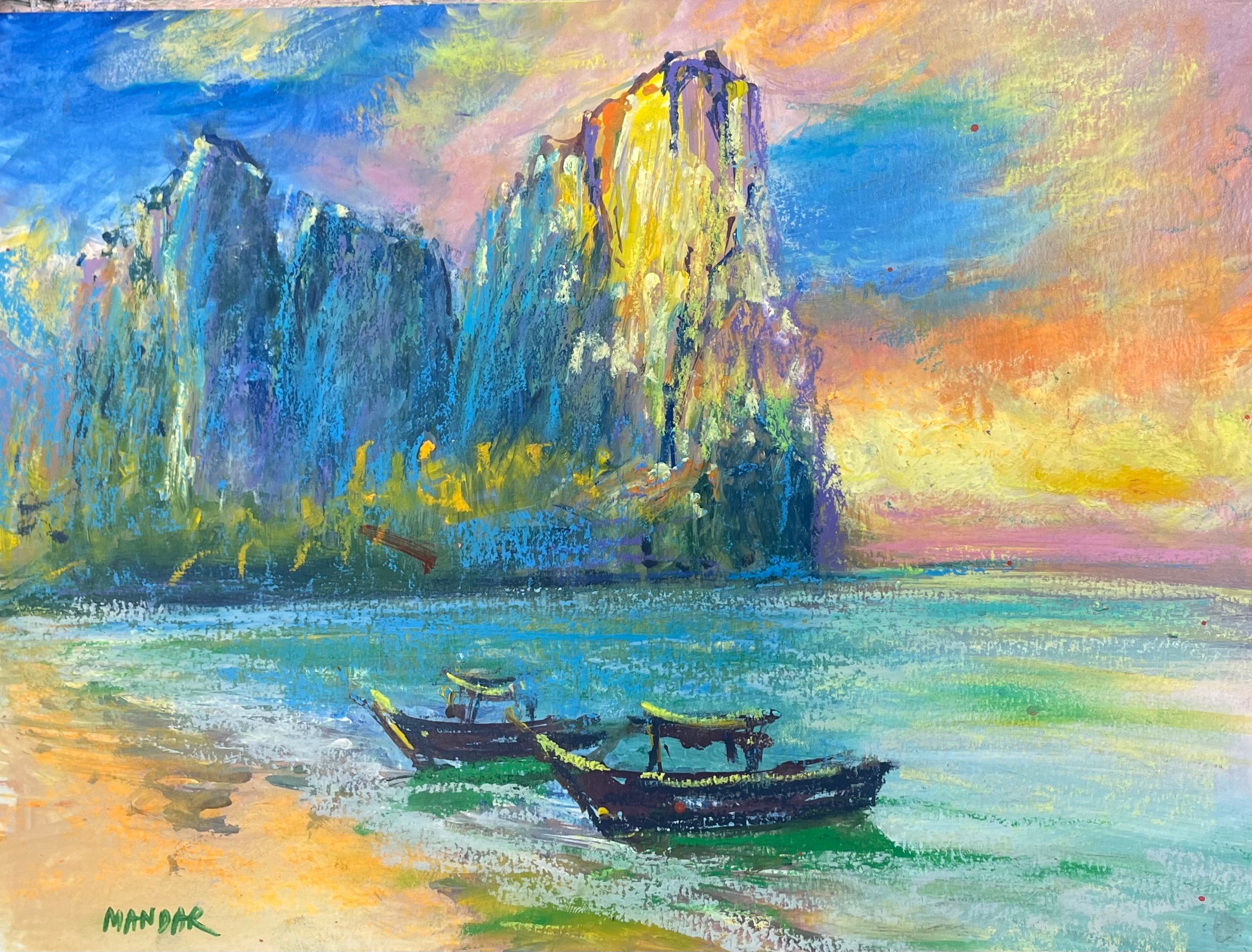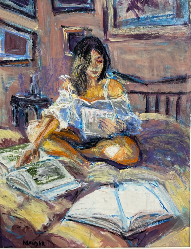 This is just one stunning example of the rich and colorful imagination of local Alameda, CA artist Mandar Wagholikar (MandarFineArt). I was a bit concerned about buying original art online, but the color and vibrancy of this piece when it arrived took my breath away. Very happy! All his work is intimate (nothing bigger than 11×14) and affordable. Also see how he does it with such speed and precision on FB: Mandar Wagholikar Fine Art. Check it out! – Jerome