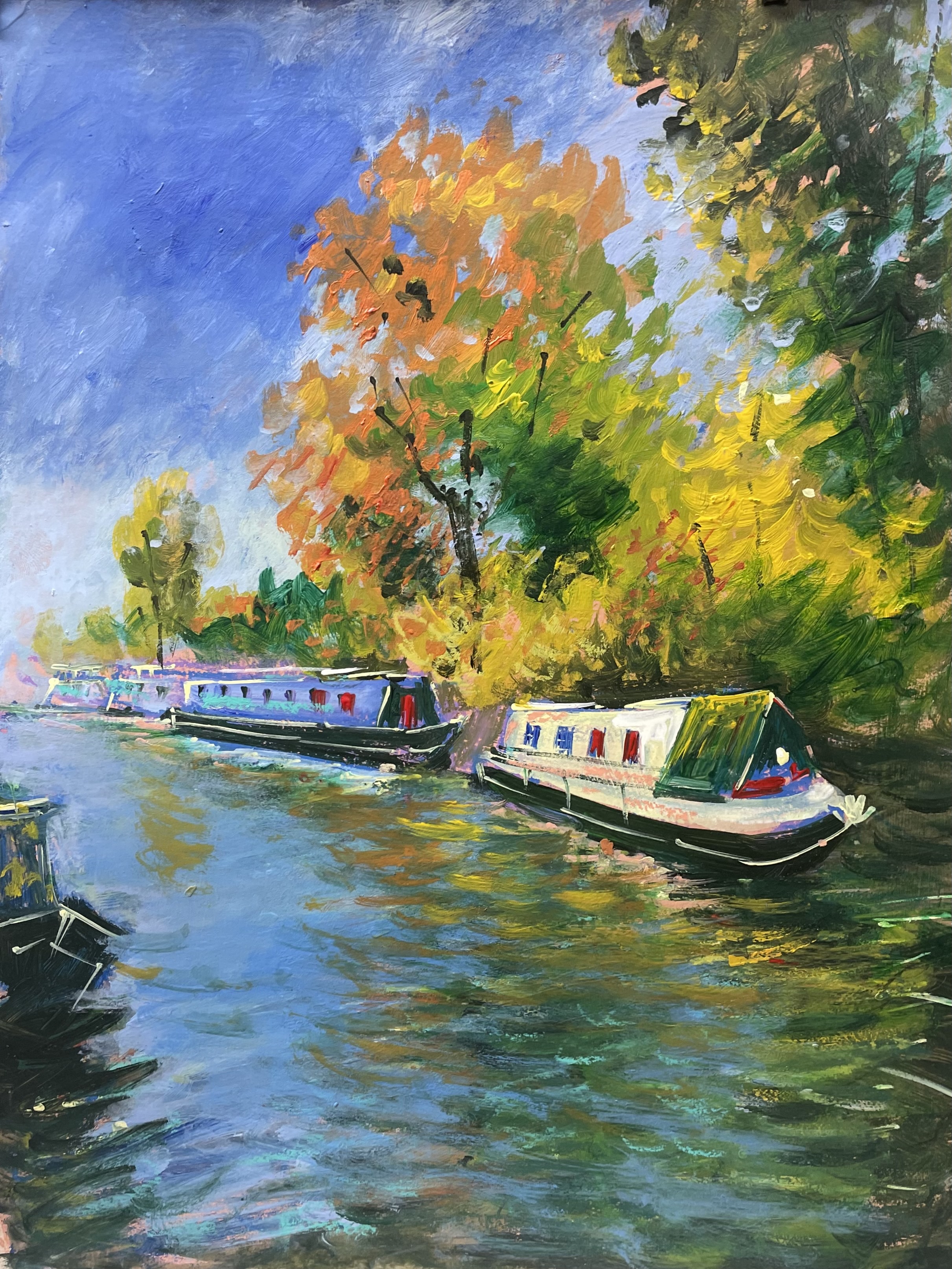 Boats with orange colored trees in the background